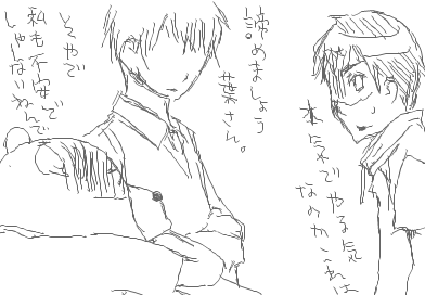 なんでしょう、描いてて楽しかったのは事実なのですが、すごいどうしようもない気分になってしまいました(笑)というかそもそも全く萌絵になってないという残念な結果にorzでも便乗したことに後悔はしてません!だってT助君が素敵だったというその魅力に引き込まれた結果なんですもの!夜だからテンションおかしいお返事ですみません!(ほんとにね!)