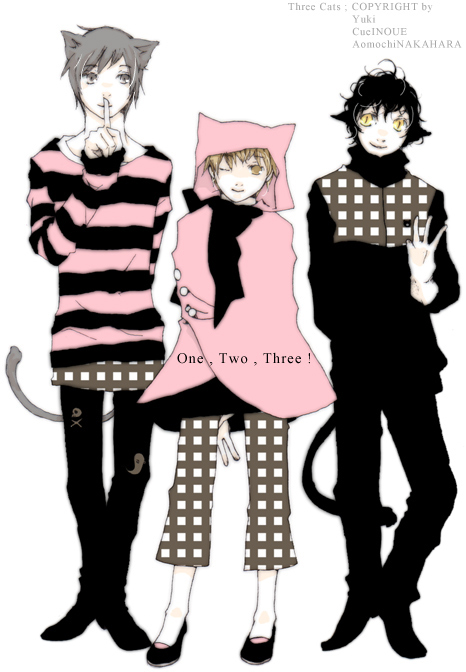 (左から チェシャさん@キューさん: 猫耳ポンチョ君@裄さん: 向@中原)