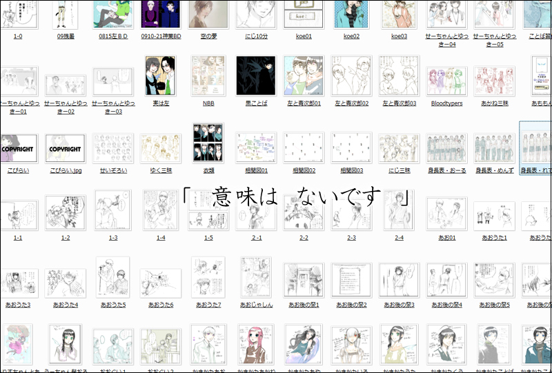 ここの日記用の画像格納庫の一覧画像です。妙に落描きばっか多いので曝してみました